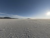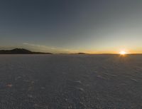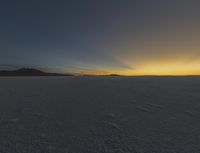 The calm of the evening creates an emotional atmosphere as the azure afterglow lights up the two-lane road winding through the dry desert of Utah, USA, with the mountain range and Bonneville Speedway in the distance.