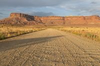 a dirt road running across a dry grass field towards a large mountainside in the distance