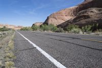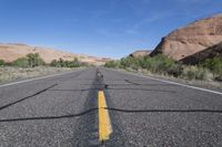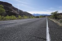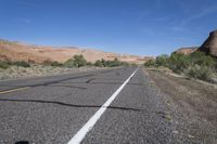 A straight road stretches through the low desert landscape of Utah, USA, surrounded by red rock formations. The asphalt road surface is marked with a yellow line, leading towards the clear blue sky. This scenic road trip offers a glimpse of the stunning canyonlands and North Wash area, with Sandthrax mountain in the distance. The highland wilderness is dotted with trees and occasional clouds, adding to the natural beauty of the region. The rock formations and geology of this badlands-like terrain are a testament to the unique landforms found in this valley. The road is bordered by gravel shoulder, enhancing the rugged profile of the landscape.