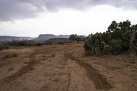 A scenic desert landscape with rocky mountains, vegetation, and a road cutting through the terrain under a gloomy grey sky.