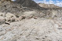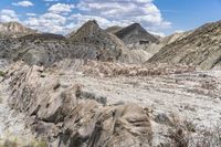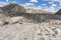 Scenic view of a desert landscape in Tabernas, Spain, with sandy terrain, rocky outcrops, and mountains in the background on a clear day.