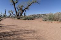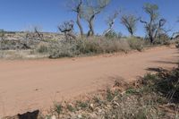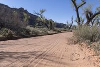 Scenic view of the red rock desert landscape in Utah, USA. The rugged terrain is filled with sand, vegetation, and majestic trees. A dirt road cuts through the wilderness, leading off-road enthusiasts on an adventurous track. The clear sky and canyonlands of Utah create a stunning natural environment.