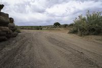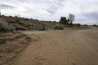 A scenic view of the red rock landscape in Utah, USA, with a straight road stretching through the desert under a gloomy grey sky. The sand street is framed by rock walls and mountains in the distance, showcasing the unique terrain and formations of San Rafael Swell.