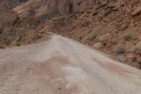 A rugged brown road surface winds through the red rock landscape of Canyonlands National Park in Utah, USA.