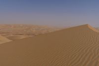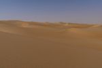 A rugged off-road track leads through the majestic Liwa Desert in the United Arab Emirates. The sandy surface is home to many Aeolian landforms such as erg and dune, while the clear sky and open horizon provide a stunning view of the Sahara's singing sand.