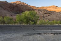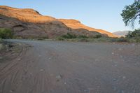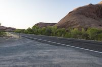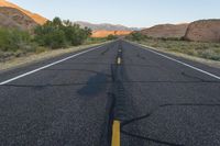 A straight road stretches through Utah's red rock desert landscape, leading to the stunning canyonlands of North Wash and Sandthrax. The clear sky above enhances the beauty of the mountain landforms and rock formations, showcasing the geology of this wilderness. The asphalt road surface, marked with yellow lines, provides a vital thoroughfare for exploring this picturesque region.