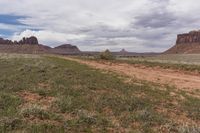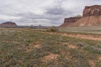 A scenic view of a desert road winding through the red rock landscape of Utah, USA, with mountains in the background and grass on the sides.