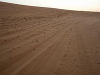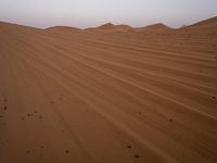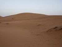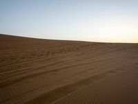 A view of the open Saharan desert in Morocco, with a road winding through the sandy landscape and the silhouettes of Aeolian landforms in the background. The clear sky and brightening horizon provide a stunning profile of the sandy surface and singing dunes.
