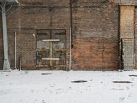 A view of a residential property in Detroit, USA, featuring a brick wall, stone wall and windows. The day is freezing, with a blizzard of snow covering the asphalt road surface, gravel and open space in the alley-way. The urban and ancient history of the art district's suburb is reflected in the packshot profile of the ruin-like brickwork, wood and doorway.