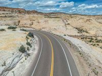 Located in the heart of Utah, the Head of the Rocks offers a breathtaking aerial view of the scenic landscape. A straight road stretches through the rural area, surrounded by vast nature and towering cliffs. From a high position, the road creates a striking visual as it cuts through the landscape, casting long shadows on the asphalt. The top-down perspective captures the beauty of this elevated road, showcasing the unique combination of nature and man-made infrastructure.