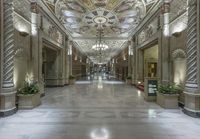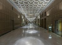 A night view of the grand and illuminated hallway of the Los Angeles Palace in California, USA. The artificial light illuminates the dark hallway, showcasing its intricate interior design and architecture. The aisle leads straight down the hallway, illuminated by a soft light that reflects off the surface floor and ceiling.