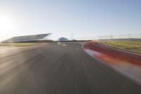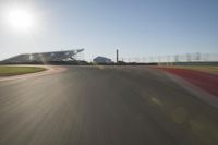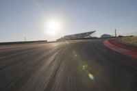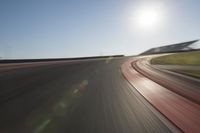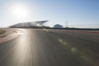 A straight highway stretches out to the horizon, with the atmosphere of a race track in the early morning sun. Automobiles race down the lane, creating motion blur as the fixed link of infrastructure and the grandstands in the distance create a sense of anticipation. The clear sky and sand on either side of the asphalt create an inviting atmosphere for a road trip, with the possibility of air travel not far away.