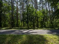 A straight road stretches down the landscape, with hard shadows cast by the trees in the Berlin forest on a clear day.