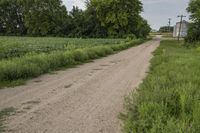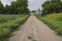 A scenic view of a gravel road winding through a field of grass and vegetation on a grey day in Bancroft, Iowa. The infrastructure of the rural landscape is visible, with farms, trees, and pastures visible from the straight path. Recreational activities and agricultural activity are common in the prairie.