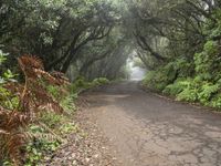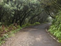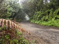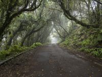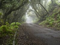 A straight dirt path leads further down the road to the city of Tenerife, Spain. A foggy, hazy, and gloomy natural environment of green vegetation, trees, and forest can be seen in the background as the grey sky creates an atmosphere of mystery.