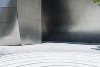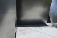 A view of the urban landscape of Los Angeles, California, USA. Concrete structures, windows, walls, floors, tiles, and other elements come together to form a futuristic architecture under the clear sky.