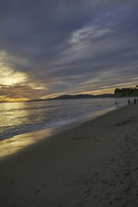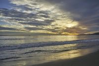 A stunning view of a dramatic dawn on the coastal shore, with sand, water, and open space. The landscape showcases the beauty of nature, as the ocean meets the shore. Clouds on the horizon add to the sense of drama, creating a captivating beach scene.