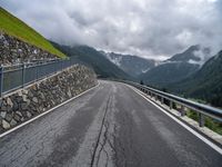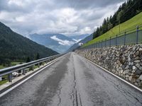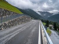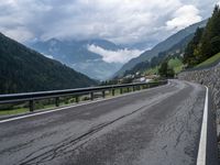 A tar-covered road winds straight down the mountain slope, guarded by an Armco barrier, in the dramatic and grey-skied Austrian highland landscape. Trees and cloud cast a gloomy atmosphere over the parallel thoroughfare, and the infrastructure creates a freezinig mode of transport.