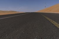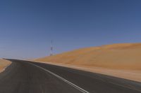 A scenic view of a winding highway in the Liwa Desert, United Arab Emirates. The endless desert, with its aeolian landforms, rugged mountains and sand dunes, can be seen stretching out endlessly under a clear sky. The asphalt road is a fixed link, connecting distant cities and a favored mode of transport for travelers embarking on a road trip.