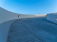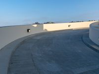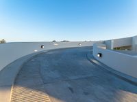 View of a residential driveway in a suburb of Los Angeles, USA, with a parking lot and parking deck in the foreground, and a hard shadow cast by the one quarter quarter of the sun at the break of day.