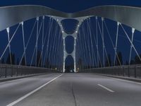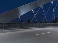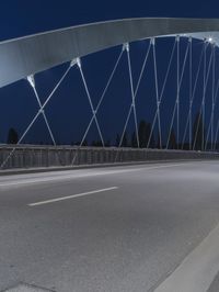 A view of the city of Frankfurt, Germany at night, illuminated by the artificial light of the cable-stayed bridge in the distance. The road in the foreground is made up of asphalt, concrete and other materials, making up the infrastructure of the European city.