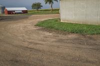 An empty road winding through the countryside of Bancroft, Iowa, on a cloudy day. The road surface is a mix of gravel, asphalt, and dirt, with lush vegetation of grass and fields on either side. The view is dominated by a large barn and a shed, with a house and other property hidden in the distance.