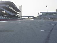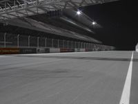 Aerial view of the Dubai Autodrome at night, showcasing the illuminated race track and the city's stunning architecture in the background. The road, paved with smooth asphalt, is ready for an exciting race. The atmosphere is electric in the arena as cars speed down the straight road towards the finish line. The metropolitan area surrounding the autodrome adds to the grandeur of this event.