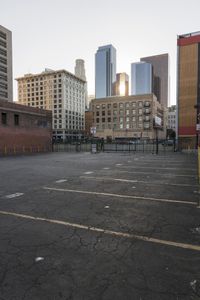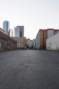 The sun is slowly rising above the Los Angeles skyline, casting a soft light over the city's urban landscape of high-rise buildings, courtyards, parking lots, and open spaces. The architecture, infrastructure, and residential areas of the California metropolis are all illuminated, offering a glimpse of the town's vibrant colors and structures.