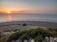 Early morning sunlight casts a warm glow on the elevated Armco Barrier road curving around the rocky coast of Mallorca, one of the Balearic Islands in Spain. The vast ocean and clear sky provide a stunning backdrop for this natural landscape.