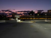 A hard shadow created by the artificial light of street lights casts across the concrete surface of a parking garage in Miami Beach, Florida at the break of day.