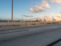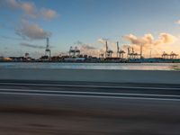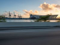 The sun is just starting to rise over the city of Miami Beach, Florida, USA, illuminating the Armco barrier and motion-blurred asphalt as a pier and harbor come into view, with the city skyline and skyscrapers providing a backdrop to the coastal urban scene.