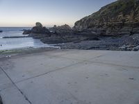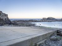 A calm morning on the Portuguese coast at break of day, with the clear sky lit up by the sun's afterglow. An azure ocean, a cobblestone beach, and a mountain formation in the background complete the peaceful landscape.
