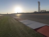 The sun rises over a race track, with a fixed link structure and asphalt road surface lined by grass and water resources. The clear sky and sunshine make the horizon visible, providing the perfect backdrop for a morning race.