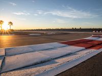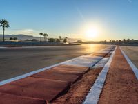 The sun is visible on the horizon as the race cars speed around the curve on the asphalt road at the break of day, bringing sunshine to the USA racing track.