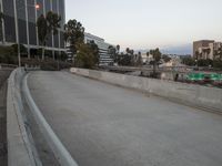 Early morning light illuminates a bridge, asphalt lane, and tree-lined walkway in an urban city, with a guard rail curving along the road surface.