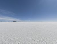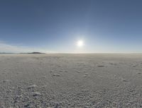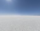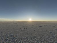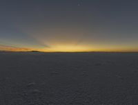 The sun rises over the salt lake desert in Utah, illuminating the horizon and a calm, azure sky. The serene atmosphere of the natural environment is visible, with dry sand, mountain, and clouds stretching to the surface of the sea.
