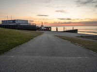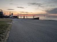 The sun rises over the Wadden Sea in Bremen, Germany, revealing a coastal landscape of asphalt roads, sandy beaches, and muddy grass. The open atmosphere is filled with a fluid combination of sunshine, clouds, and the ocean's waves. A jetty, pier, and harbor provide docking points for boats at the Bremerhafen, while a clear sky opens up the horizon with the afterglow of a new day in Europe.
