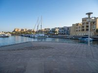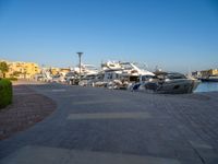 Along Egypt's stunning coastline, a picturesque marina and jetty welcome visitors to the harbor at dawn. The open space by the water features a pier and boat ramp, perfect for exploring the clear skies and tranquil ocean views. Pavers line the surface as boats gently sway against the backdrop of the African coast. This coastal oasis offers a serene break of day, ideal for a peaceful retreat by the sea.