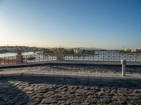 Located on Egypt's coastal residential area, a modern bridge spans over the ocean, connecting the urban landscape with the pier and jetty. The break of day reveals a clear sky and the sun shining over the cobblestone road. Modern architecture profiles the skyline, while the harbor bustles with activity under the sunny African sky. Residential quarters line the road near the bridge, offering a picturesque view of the ocean and urban life.
