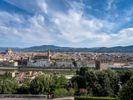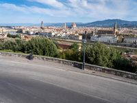 An elevated road winds its way through the landscape of Tuscany, Italy, providing a top-down view of the lush gardens and rolling hills of the region. On a sunny day, the clouds in the sky provide a beautiful backdrop to the scene.