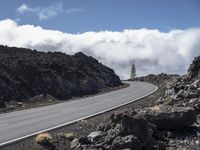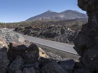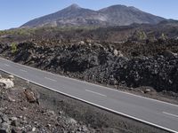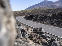 Aerial view of a highway winding through the Tenerife highlands in Spain. The road is flanked by breathtaking views of rugged rock formations, clear skies, and desert wildlands, with the asphalt offering an elevated view of the mountain pass.