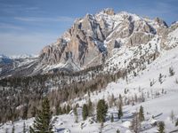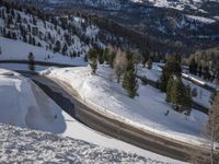 Aerial view of the snow-capped mountain range of the Alps in Europe, with a winding road cutting through the wilderness terrain and a clear winter sky with contrails.