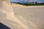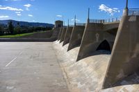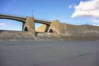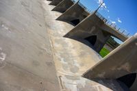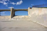 Standing atop a bridge in the United States, a concrete surface stretches straight down the road in a profile view of Los Angeles, California. High in the sky, the sun shines down among the clouds on this bright day.