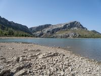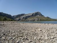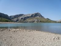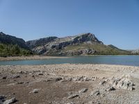 A top-down view of a landscape featuring a lake shore with sandy and graveled surfaces, mountains in the background, and a clear sky above.