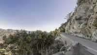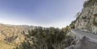 A road snakes through a rocky landscape of mountains, badlands, and trees with an Armco barrier providing an overlook of the wilderness below against a clear sky at dawn.
