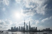 A stunning aerial view of the modern architecture and cityscape of Shanghai, China. The high buildings overlook the urban landscape, with clouds and the sun visible in the sunny sky. This overview showcases the vibrant municipality of Shanghai in Asia.