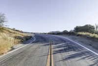 A winding road stretches out through the landscape with a clear sky overhead, leading off into the horizon. The asphalt surface is framed by mountains, trees, and vegetation, as the lane curves and stretches straight down the road, providing a path for transport and road trips at dawn.