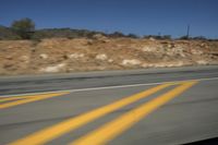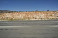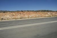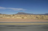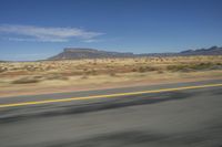 An asphalt road cuts through the endless African desert landscape with mountains in the background.