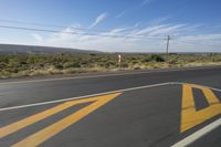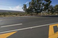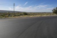 An endless road stretches through the beautiful African landscape, with mountains and highlands in the background. The road surface is covered in asphalt, lined with grass and trees, under a clear sky with fluffy clouds. Overhead power lines provide electricity to the nearby city. A motor vehicle drives along the road, surrounded by natural vegetation and woody plants. The parallel lines of the road create a sense of motion blur and add to the scenic beauty of the journey.
