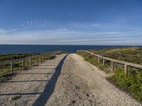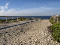 A sand street stretching along the European coast of Portugal, with a road surface of asphalt, gravel, and dirt, surrounded by a guard rail and Armco barrier, with a backdrop of a lake, vegetation, and a clear sky with azure hues.
